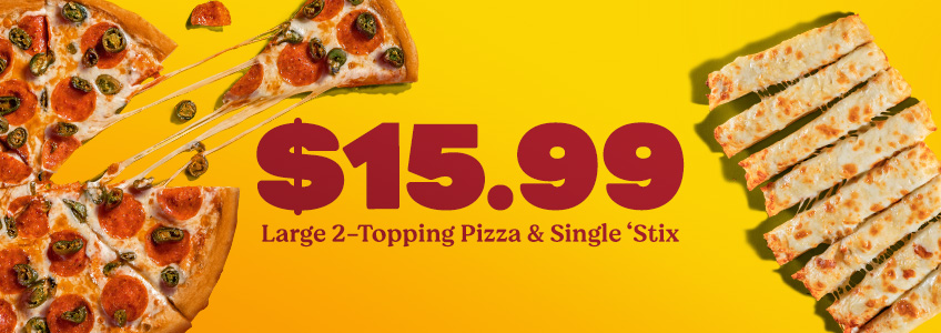 Get a Large up to 2-Topping Pizza and Single Original Topperstix for just $15.99. Upgrade to House Pizza or Signature Pizza for an additional charge.