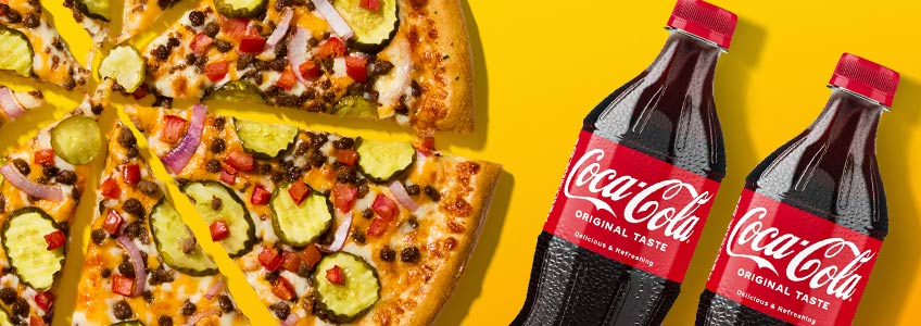 Get a Medium House or Signature Pizza and two 20 oz. drinks for just $13.99. And try the NEW Cheeseburger Pizza!